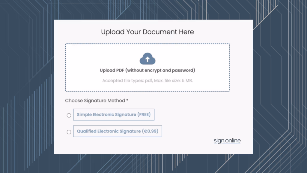 sign.online’s digital signature web application offers 40+ Qualified or Advanced Electronic Signatures, plus our free Simple Electronic Signature.
